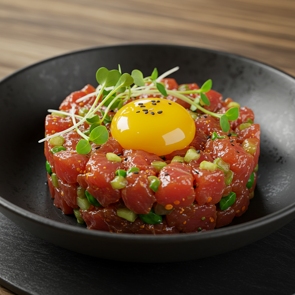 The Creaminess – Avocado & Egg Yolk: The smooth avocado mousse and the rich, runny quail egg yolk create a luxurious sauce that coats every piece of tuna. It tempers the spice and adds a decadent texture.